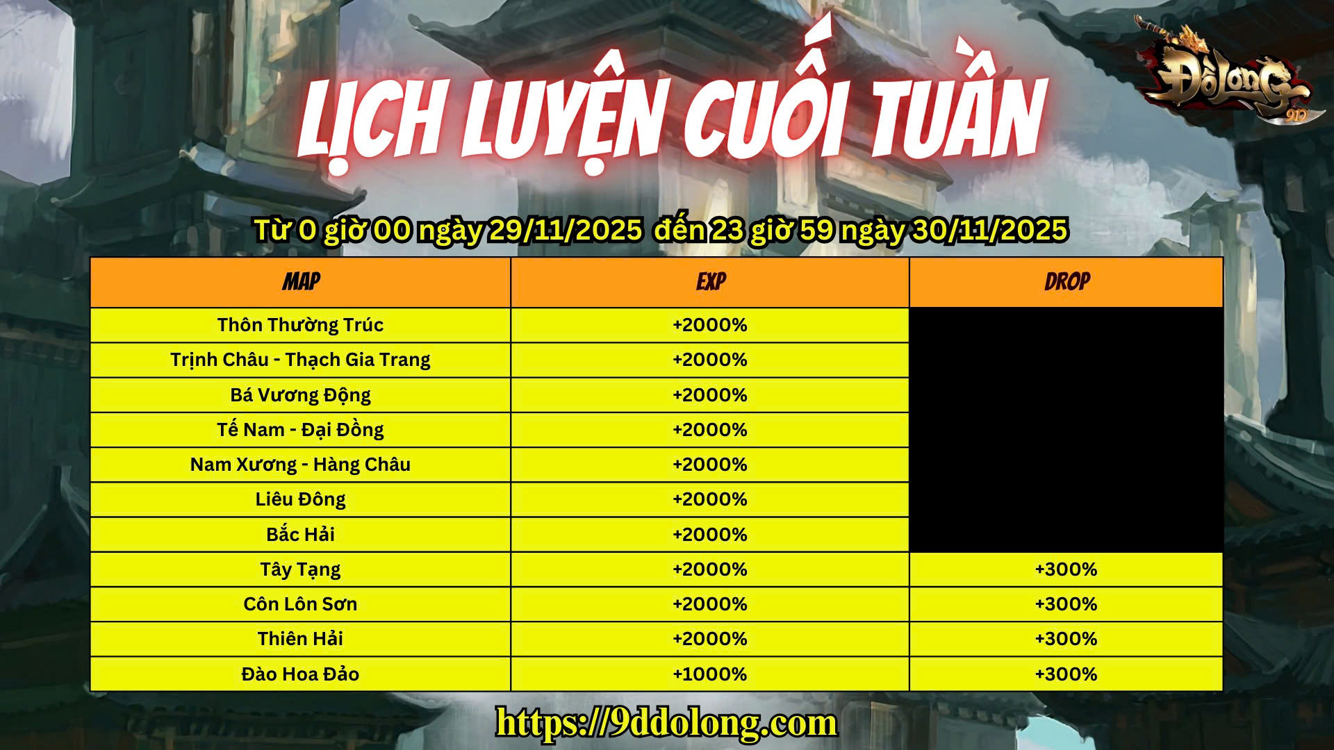 +2000% EXP tại: Thôn Thường Trúc, Trịnh Châu – Thạch Gia Trang, Bá Vương Động, Tế Nam – Đại Đồng, Nam Xương – Hàng Châu, Liêu Đông, Bắc Hải, Tây Tạng, Côn Lôn Sơn, Thiên Hải.